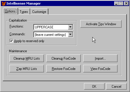 The Options tab allows setting the global settings for capitalization of commands and functions. It also is a place to perform routine maintenance: