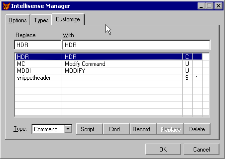 Finally, the Customize Tab on the IntelliSense Manager allows for the editing and maitenance of